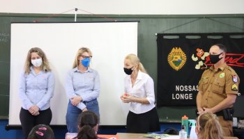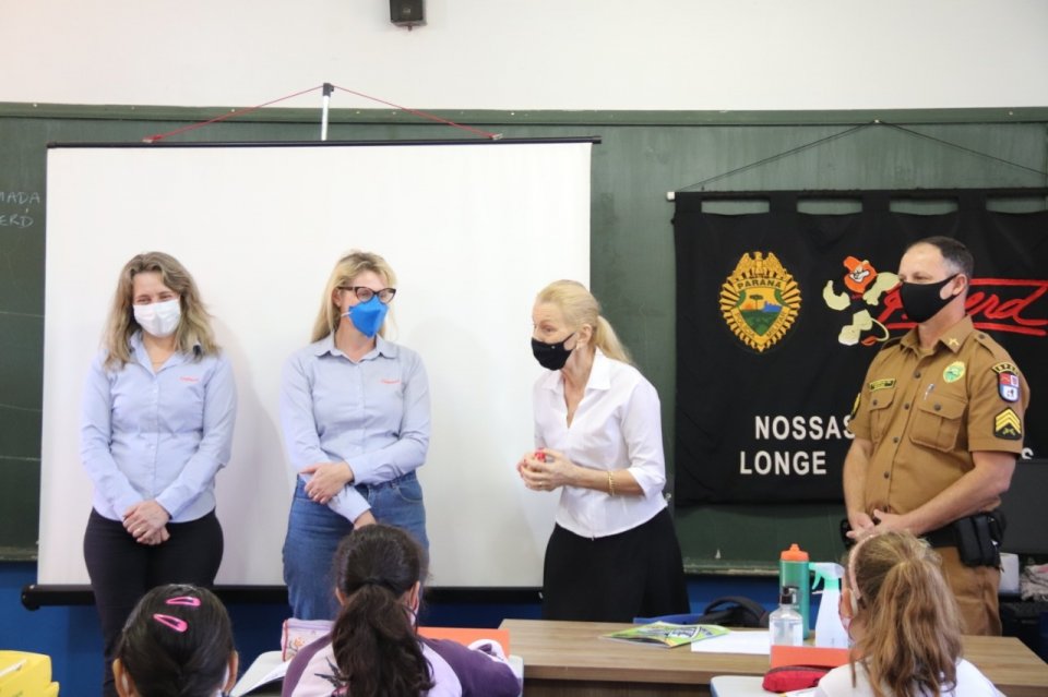 Iniciou na segunda - feira (30) o Programa Educacional de Resistência às Drogas e a Violência – Proerd – nas escolas municipais de Cafelândia. Para marcar o retorno das atividades, nesta terça-feira (31) após mais de um ano e meio parado devido a pandemia, a secretária de Educação e Cultura, professora Rozane Pitol, juntamente com a equipe pedagógica da SEMEC, o soldado Edinaldo Comenta Nunes e ainda a Assessoria de Cooperativismo da Copacol, Elizete Lunelli Dal Molin e a coordenadora dos projetos sociais da Copacol, Gislaine Pontes Fernandes, estiveram visitando os 5º anos e explicando como funcionará o projeto.