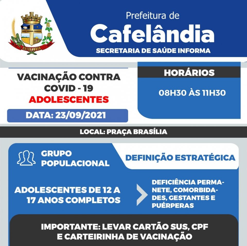 O município de Cafelândia, por intermédio da secretaria de Saúde, inicia na próxima quinta-feira (23) a vacinação para Covid - 19 para adolescentes com idade entre 12 a 17 anos com comorbidades, deficiência permanente e gestantes e puérperas. Serão 300 doses disponíveis apenas no período matutino.