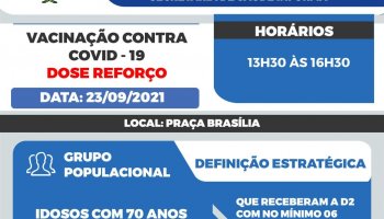 A vacinação será das 13h30 às 16h30 na Praça Brasília e nesta primeira etapa serão disponibilizadas 60 doses para os idosos com mais de 70 anos e 84 para as pessoas imunossuprimidas.