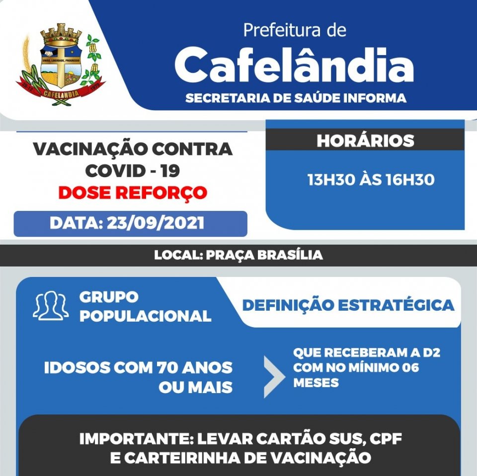 A Secretaria de Saúde de Cafelândia, seguindo o Plano Nacional e Estadual de Imunização contra a Covid -19 inicia na quinta-feira (23) a tarde a imunização da dose de reforço, ou D3, para todos os idosos acima de 70 anos. A vacina só será aplicada seis meses após a última dose do esquema vacinal (segunda dose ou dose única), independente do imunizante aplicado.