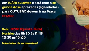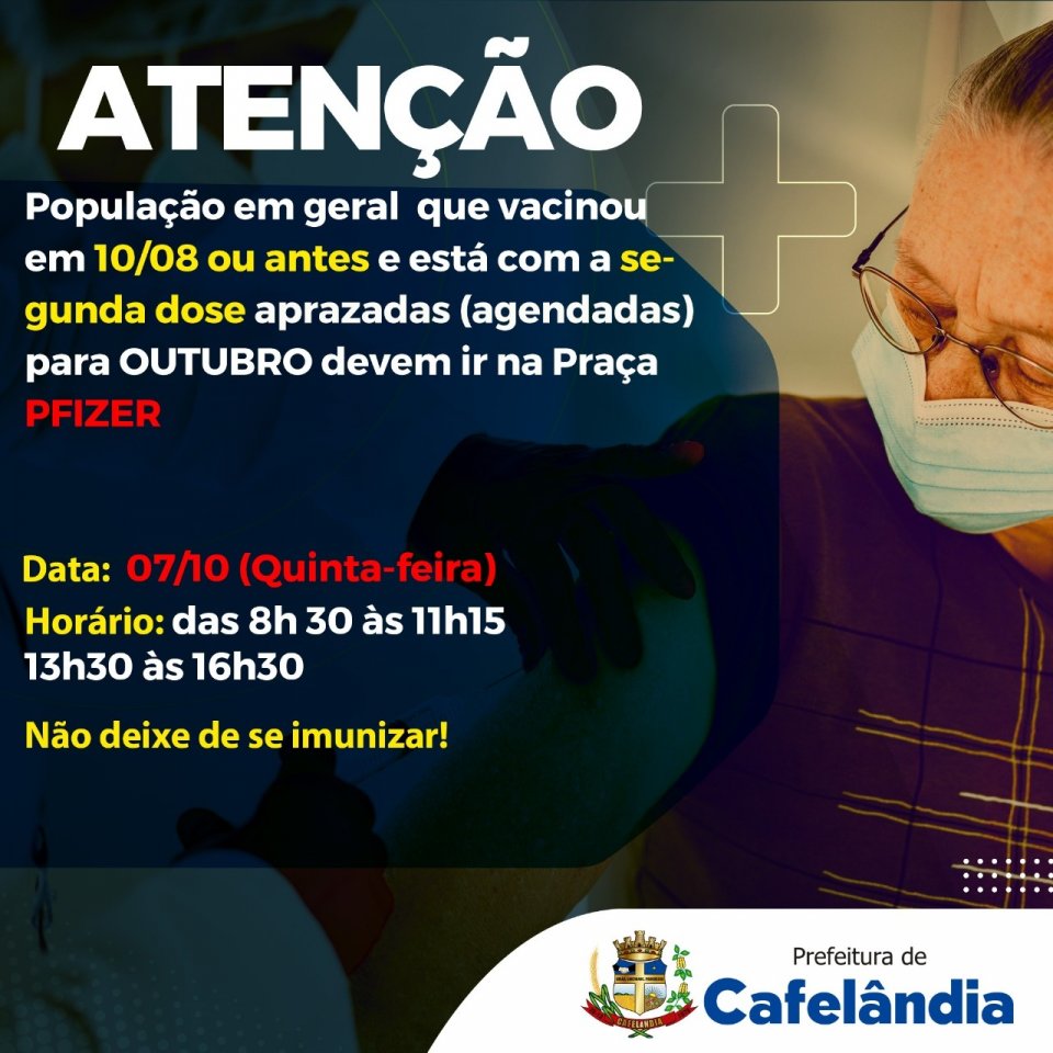 A secretaria de Saúde de Cafelândia, atendendo a normativa do Estado do Paraná, vai antecipar a aplicação da segunda dose da vacina contra a Covid-19 da Pfizer para quem tomou a primeira dose há 56 dias ou mais. A aplicação será quinta-feira (07) na Praça Brasília das 8h30 às 11h15 e das 13h30 às 16h30. “Para a comunidade entender melhor, quem tomou a primeira dose da vacina Pfizer no dia 10 de agosto ou antes e está com ela aprazada (agendada) na carteirinha de vacinação para o mês de outubro, poderá receber esse adiantamento na quinta-feira, dia 07. Serão centenas de doses disponíveis em Cafelândia para que assim mais pessoas fiquem com o esquema vacinal em dia”, destacou a secretária de Saúde, Sarah Massaneiro.