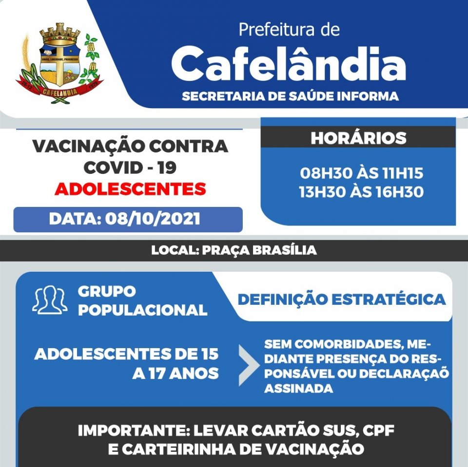 O município de Cafelândia, por meio da secretaria de Saúde, informa a comunidade que na próxima sexta-feira (08/10) a vacinação acontecerá em adolescentes contra a Covid-19, seguindo as orientações e normativas do Estado.