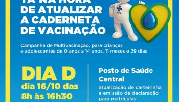 “A Campanha é mais uma chance que os pais têm de procurarem as unidades de saúde para colocarem em dia os cartões de vacina. É um período em que intensificamos nossas ações, para lembrar a todos da importância da vacina. Estaremos fazendo o Dia “D” no sábado, não esqueçam de levar seu filho (a) no Posto de Saúde Central e ainda a carteirinha de vacinação para que a declaração de vacina, que será obrigatória no ato da matrícula”, informou a secretária de Saúde, Sarah Massaneiro.