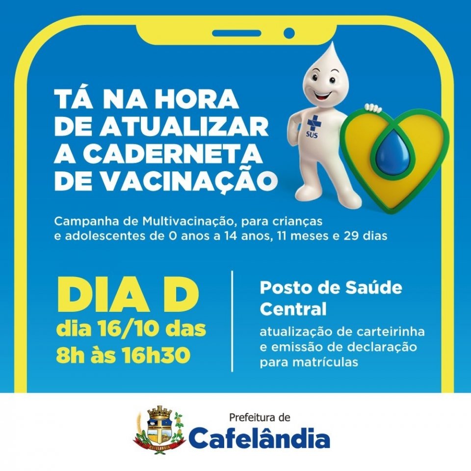 No sábado, dia 16 de outubro, acontece em Cafelândia a campanha de Multivacinação das 8h30 às 16h30, no Posto de Saúde Central.
