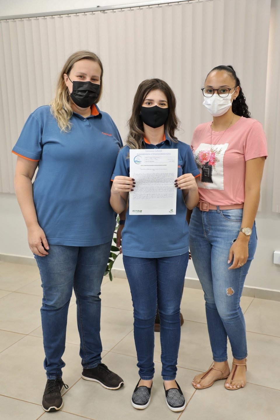 A autora do texto premiado em primeiro lugar foi da Jovem Aprendiz da Copacol, Mayara Szpakowiski, 17 anos, e que trabalha no setor administrativo da Indústria de Peixe. O título da sua redação foi Piscicultura: fator que move a economia do município.