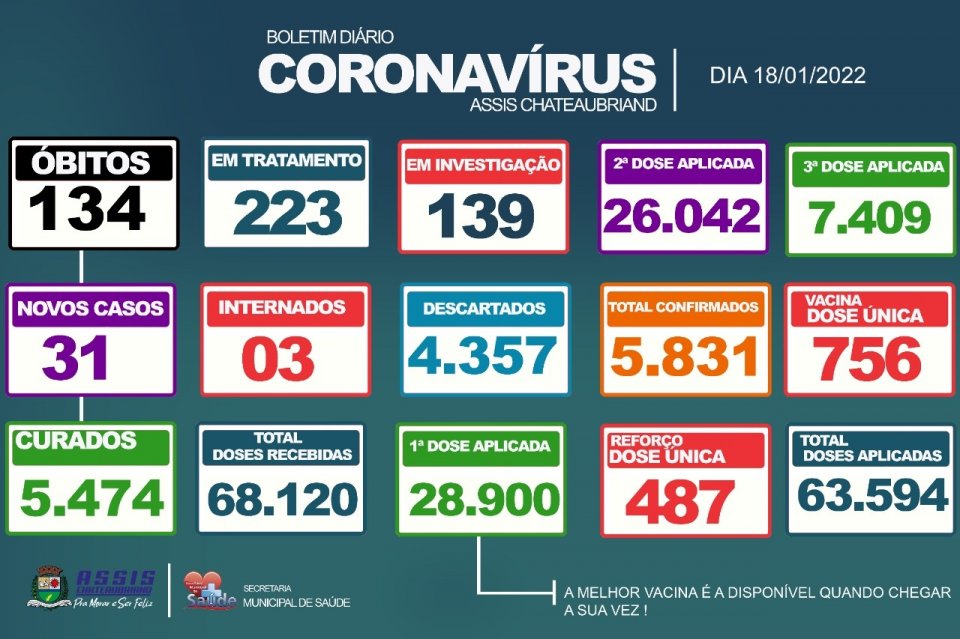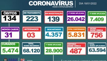 Trinta e um novos casos de Covid-19 foram confirmados em Assis Chateaubriand, através do boletim desta terça-feira (18), totalizando 5.831 pessoas contaminadas. Destas, 5.474 estão curadas. Entre os resultados positivos estão 10 mulheres com idade entre (18 e 54 anos) e 21 homens com idades entre (15 e 66) anos.