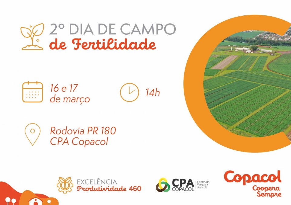 A Copacol realiza quarta e quinta-feira a segunda edição do Dia de Campo Fertilidade, com palestras e visitas técnicas aos experimentos realizados no CPA (Centro de Pesquisa Agrícola), localizado em Cafelândia.
