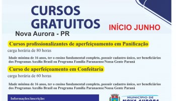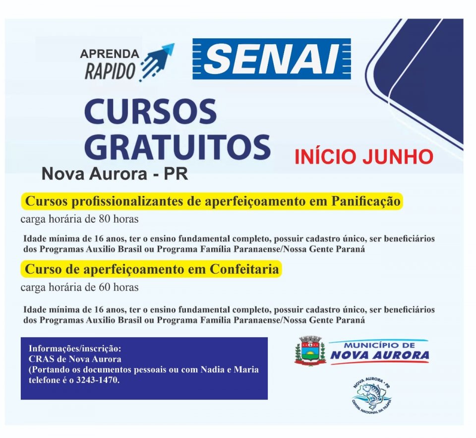 Os dois cursos serão realizados pelo SENAI e terão início no mês de Junho no município de Nova Aurora. Segundo a equipe da Assistência esses cursos são uma ótima oportunidade para se qualificar e se aperfeiçoar profissionalmente, os cursos são inteiramente gratuitos e os alunos receberão certificado do SENAI.