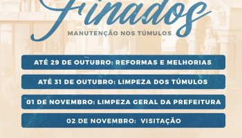 O horário de funcionamento do cemitério é das 8h às 17h30. Já os serviços de limpeza dos túmulos poderão ser feitos até o dia 31 de outubro, sendo o dia 01 reservado a limpeza geral por parte da prefeitura e dia 02 aberto apenas para visitação.