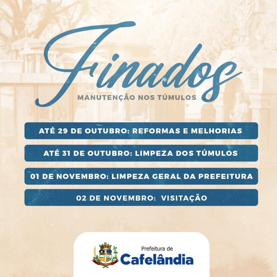 A secretaria de Viação e Obras definiu nesta segunda-feira (24) os prazos para execução de reformas e melhorias nos túmulos do Cemitério Municipal de Cafelândia está fixado até o próximo dia 29 de outubro, sábado, que antecede o feriado de Finados. O cumprimento do prazo visa o tempo hábil para intensificação da limpeza do local para o Dia de Finados, em 02 de novembro.