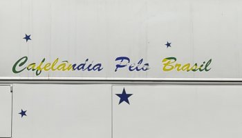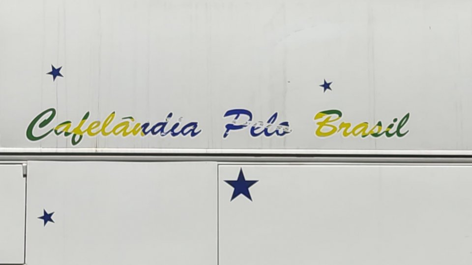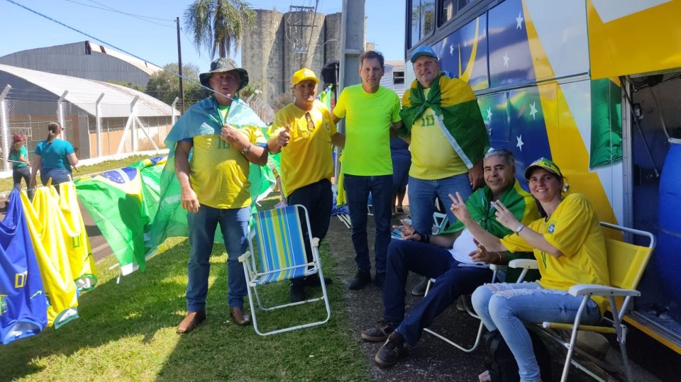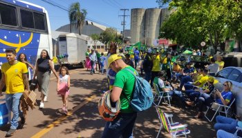 Vestidas de verde e amarelo, as pessoas seguram bandeiras e acenam para os carros que transitam pela via.