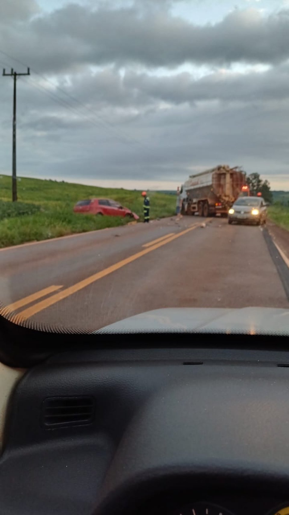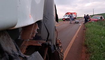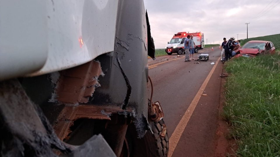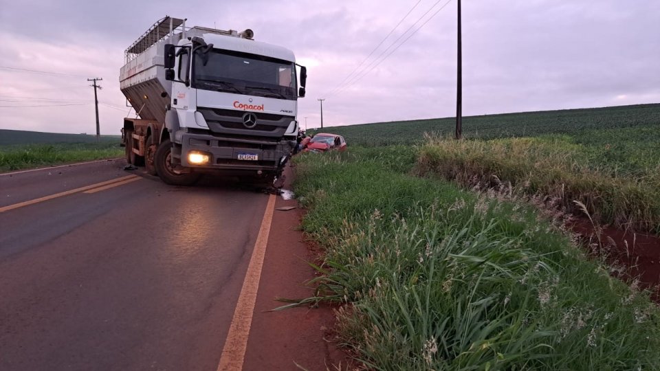 Segundo o motorista do caminhão que estava indo sentido Nova Aurora, o Palio seguia sentido Cafelândia e entrou na pista contrária e acabou batendo de frente com o caminhão.