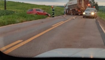Foi registrado neste início de manhã de domingo dia 31, um acidente tipo colisão frontal envolvendo um caminhão de ração e um Fiat Palio na PR 180.