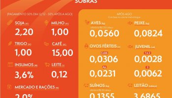 No caso das complementações pagas 100% nesta sexta-feira os valores definidos por meio do cálculo baseado na divisão de frutos são: R$ 21,5509 por leitão e R$ 0,5951 por suíno (com referência de R$ 20 por cabeça) R$ 0,60 por quilo de peixe (referência de 0,10 centavos o quilo) R$ 0,0201 por juvenil 1 e 2/ R$ 0,0543 por juvenil 3. Na avicultura, R$ 0,6362 por quilo de frango (referência de R$ 1 por ave) e nos ovos férteis serão repassados R$ 0,1842 (Cobb) e R$ 0,1390 (AP) por unidade.