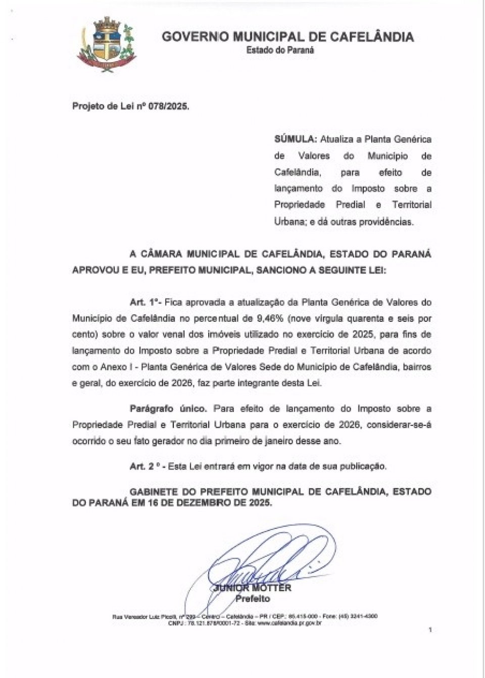 Com pedido do vereador Edson Anzen, popular Torinho, e aprovação da maioria dos vereadores, menos do vereador Rodrigo Acordi, foi vetado da pauta a proposta do prefeito Junior Motter, de aumento de 9,46% do IPTU (Imposto Predial e Territorial Urbano), do município de Cafelândia.