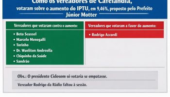 Segundo o vereador Torinho o projeto de aumento foi pedido para tirar de pauta, porque foi bem acima da inflação de 4,18%. “Pedi para tirar de pauta e agradeço a maioria dos vereadores que atenderam, porque, é injusto para a população de Cafelândia um aumento de 9,46 % no IPTU, já que a inflação foi bem abaixo deste índice”, afirma o vereador.