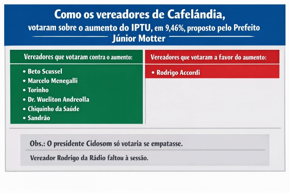 Com pedido do vereador Edson Anzen, popular Torinho, e aprovação da maioria dos vereadores, menos do vereador Rodrigo Accordi, foi vetado da pauta a proposta do prefeito Junior Motter, de aumento de 9,46% do IPTU (Imposto Predial e Territorial Urbano), do município de Cafelândia.