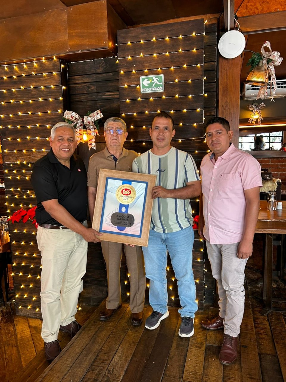 O prêmio foi entregue por Rodolfo Solano, gerente regional da Cobb para Peru, Bolívia e Equador, em um evento que contou com a presença do Dr. Néstor Oropeza, proprietário da Avícola Warnes, bem como dos profissionais Dr. Sevriche e Dr. Daza e de membros da família, que celebraram essa importante conquista.