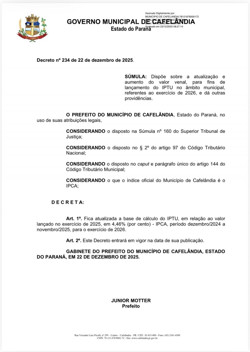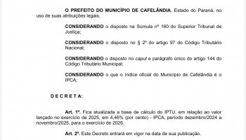 O prefeito publicou decreto sem mandar para a Câmara de Vereadores, baseado nos índices da inflação de 4,46% de aumento no IPTU de Cafelândia.