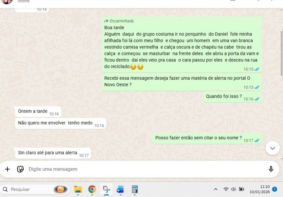 Uma mulher entrou em contato com o Portal O Novo Oeste, denunciando uma situação de importunação sexual, quando um homem parou uma van branca abriu a porta e começou a se masturbar na frente das crianças, nesta tarde de sexta-feira dia 9, no parque do Bairro Daniel Folle.