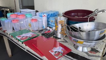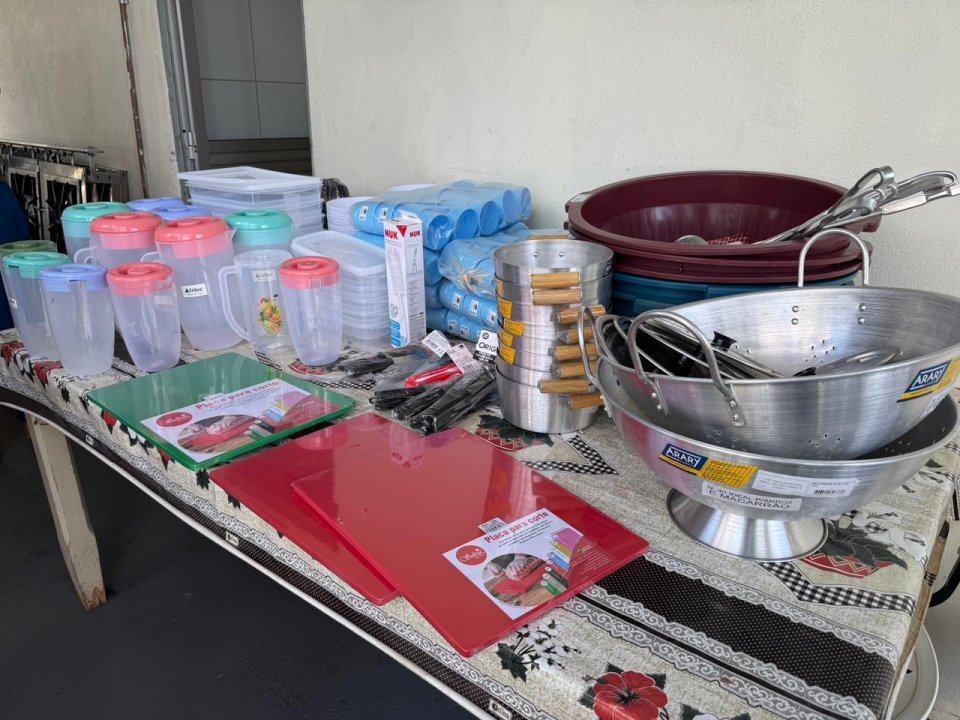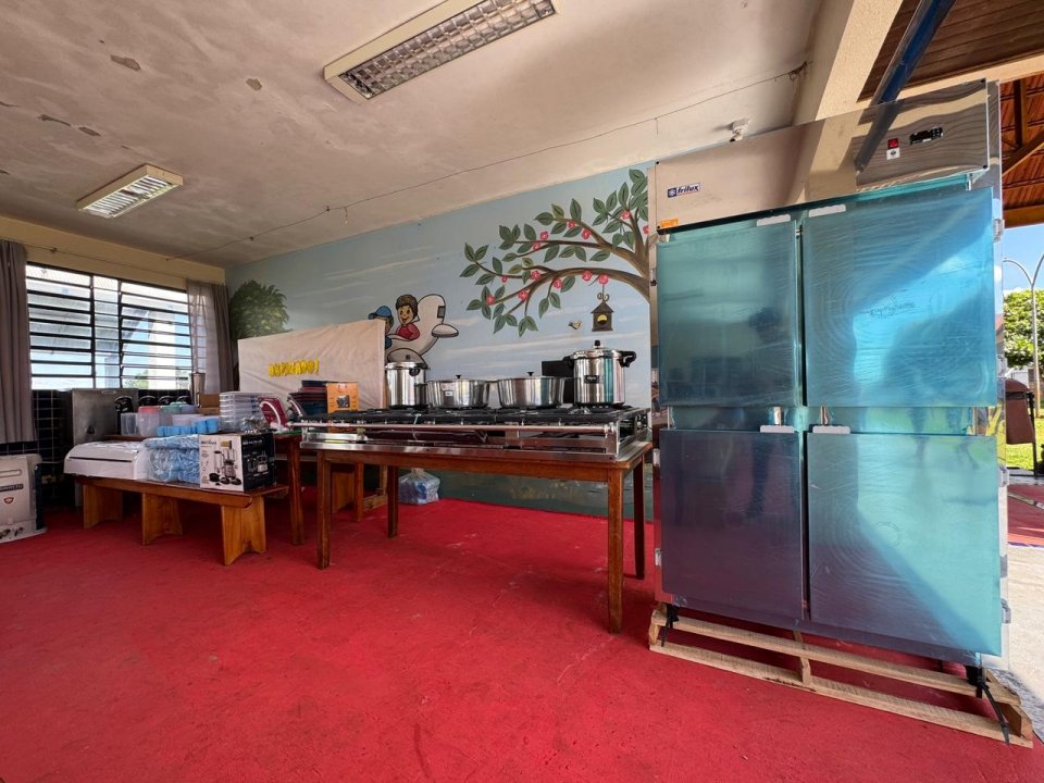 Entre os itens entregues estão fogão industrial de 8 bocas, ar-condicionado, refrigerador tipo câmara fria, além de panelas, pratos, talheres, canecas, liquidificador e diversos utensílios que irão reforçar o trabalho diário nas cozinhas escolares.