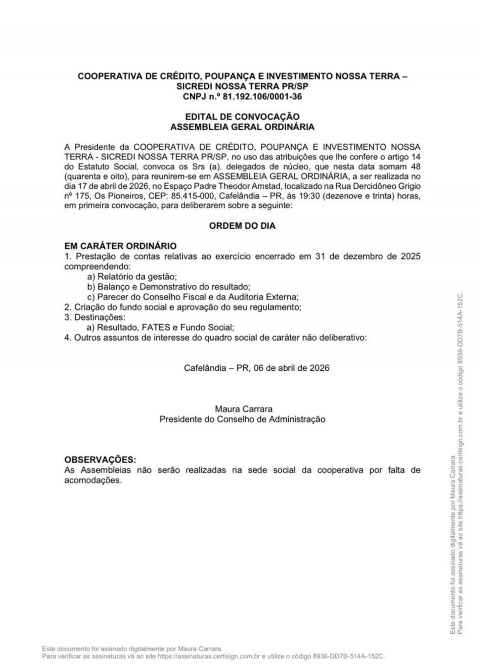 Portal O Novo Oeste - Sicredi Nossa Terra publica edital de convocação para Assembleia Geral Ordinária