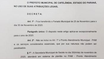 Foi publicado um decreto Municipal transferindo o feriado Municipal de Cafelândia do dia 25 para dia 30 de Novembro.