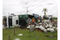 Um caminhão que transportava barris de chope tombou, na tarde desta quinta-feira (18), na BR-376, em...